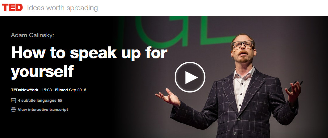 Example, how to speak up for yourself? Adam Galinsky, social psychologist, talks about how to speak up for yourself without being seen as self-serving (around the 6-minute mark in the video).